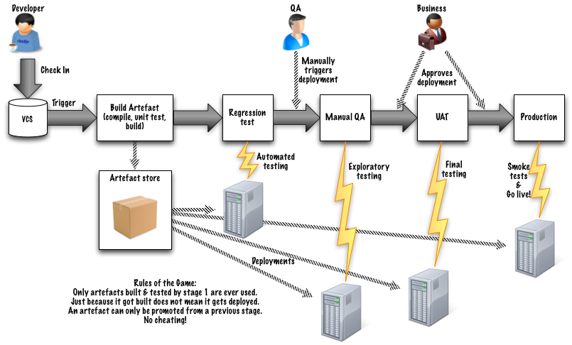 After passing this stage, the automated deployments stop. Any further progress is triggered manually in order to maintain release control (remember, we are talking Continuous Integration here, not Continuous Deployment).
